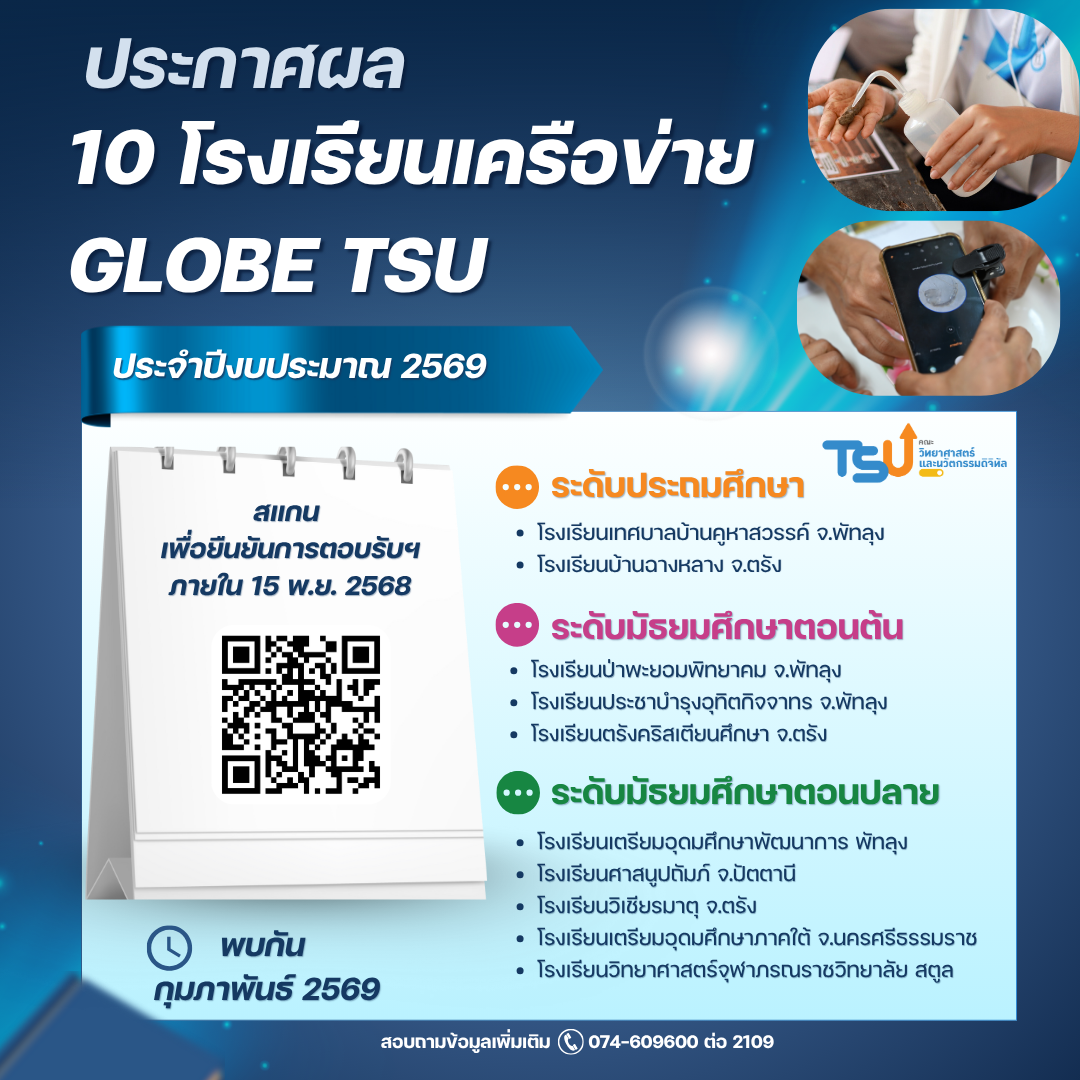 คณะวิทยาศาสตร์และนวัตกรรมดิจิทัล มหาวิทยาลัยทักษิณ เปิดรับสมัคร โรงเรียนเข้าร่วมเป็นเครือข่าย GLOBE TSU จำนวน 10 โรงเรียน ในระดับประถมศึกษาตอนปลาย ถึง มัธยมศึกษาตอนปลาย ในปีงบประมาณ 2569