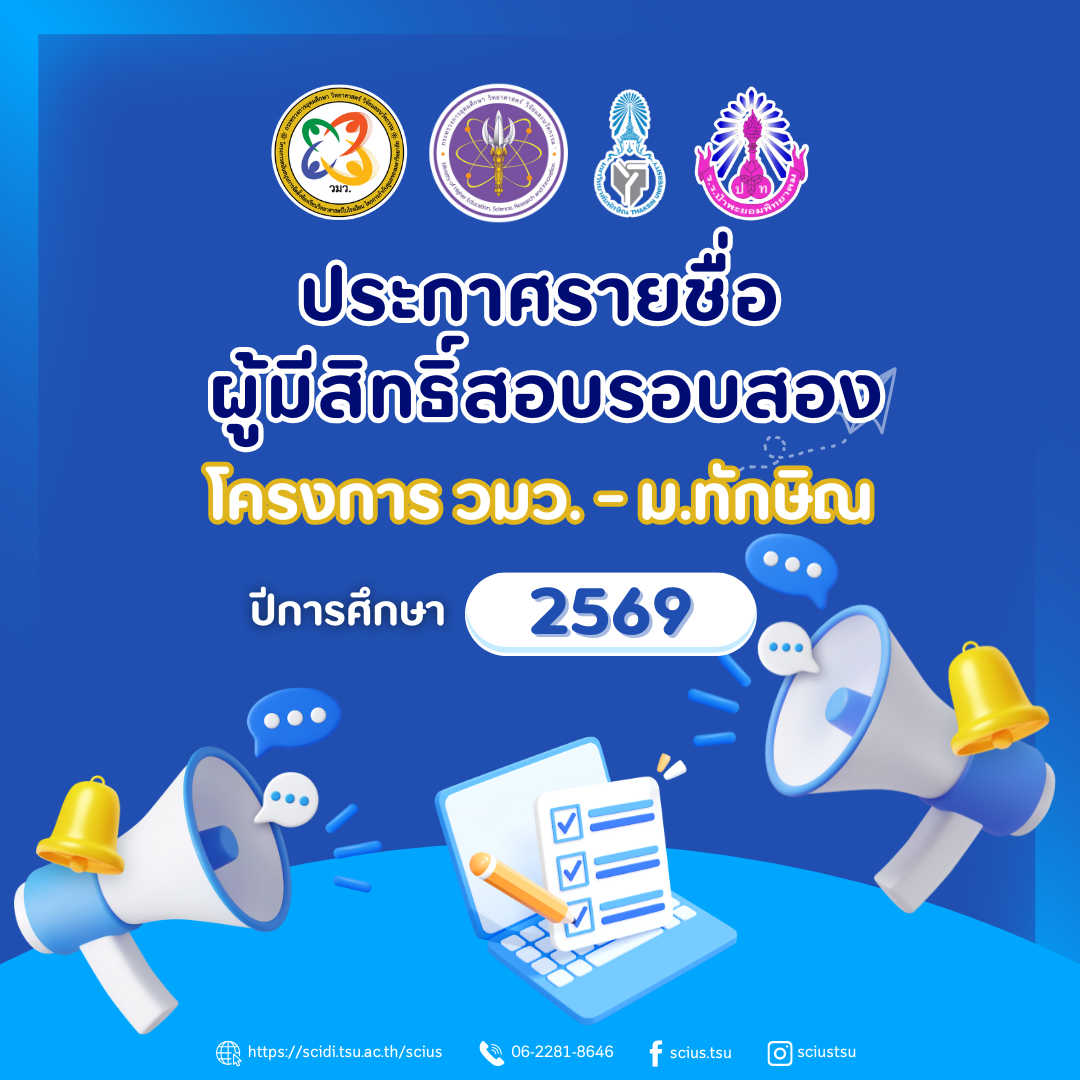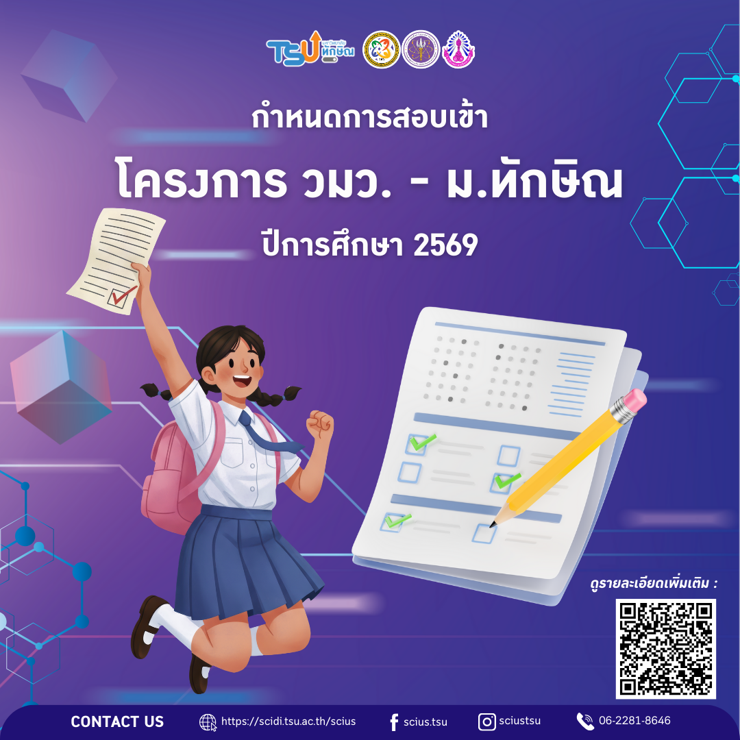 ขอชวนน้องๆ นักเรียน ครู ผู้ปกครอง และผู้ที่สนใจทุกคน มาร่วมงาน "งานสัปดาห์วิทยาศาสตร์แห่งชาติ ประจำปี 2568" โครงการ วมว. – ม.ทักษิณ 📅 ระหว่างวันที่ 18 – 20 สิงหาคม 2568 📍 ณ โครงการ วมว. - ม.ทักษิณ คณะวิทยาศาสตร์และนวัตกรรมดิจิทัล มหาวิทยาลัยทักษิณ