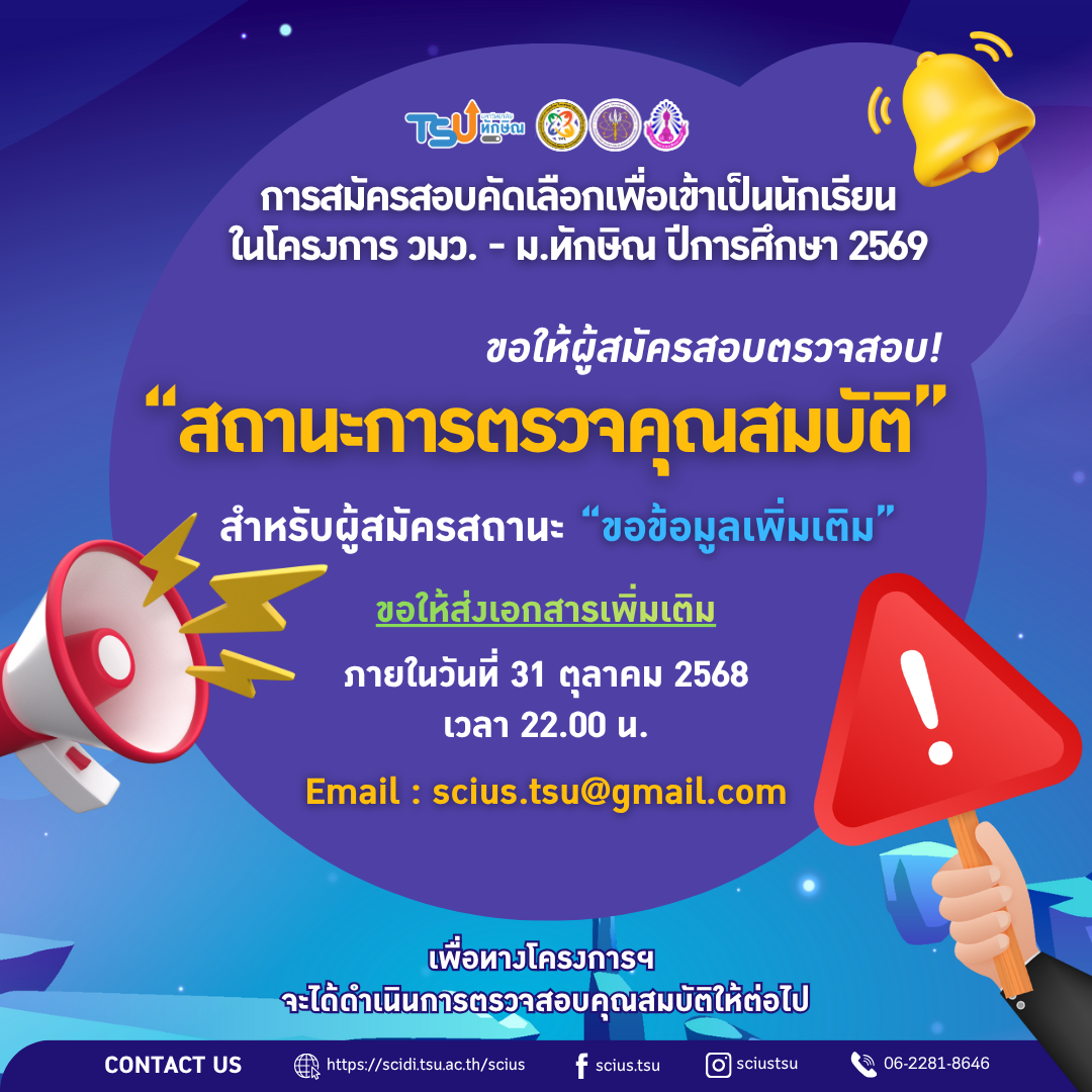 📢 ปุกาด ปุกาด! 📢 ✨ถึง น้อง ๆ ผู้สมัครโครงการ วมว. - ม.ทักษิณ ปีการศึกษา 2569 📢 ขอให้นักเรียนเข้าตรวจสอบ "สถานะการตรวจคุณสมบัติ" ในระบบรับสมัครของ MWIT