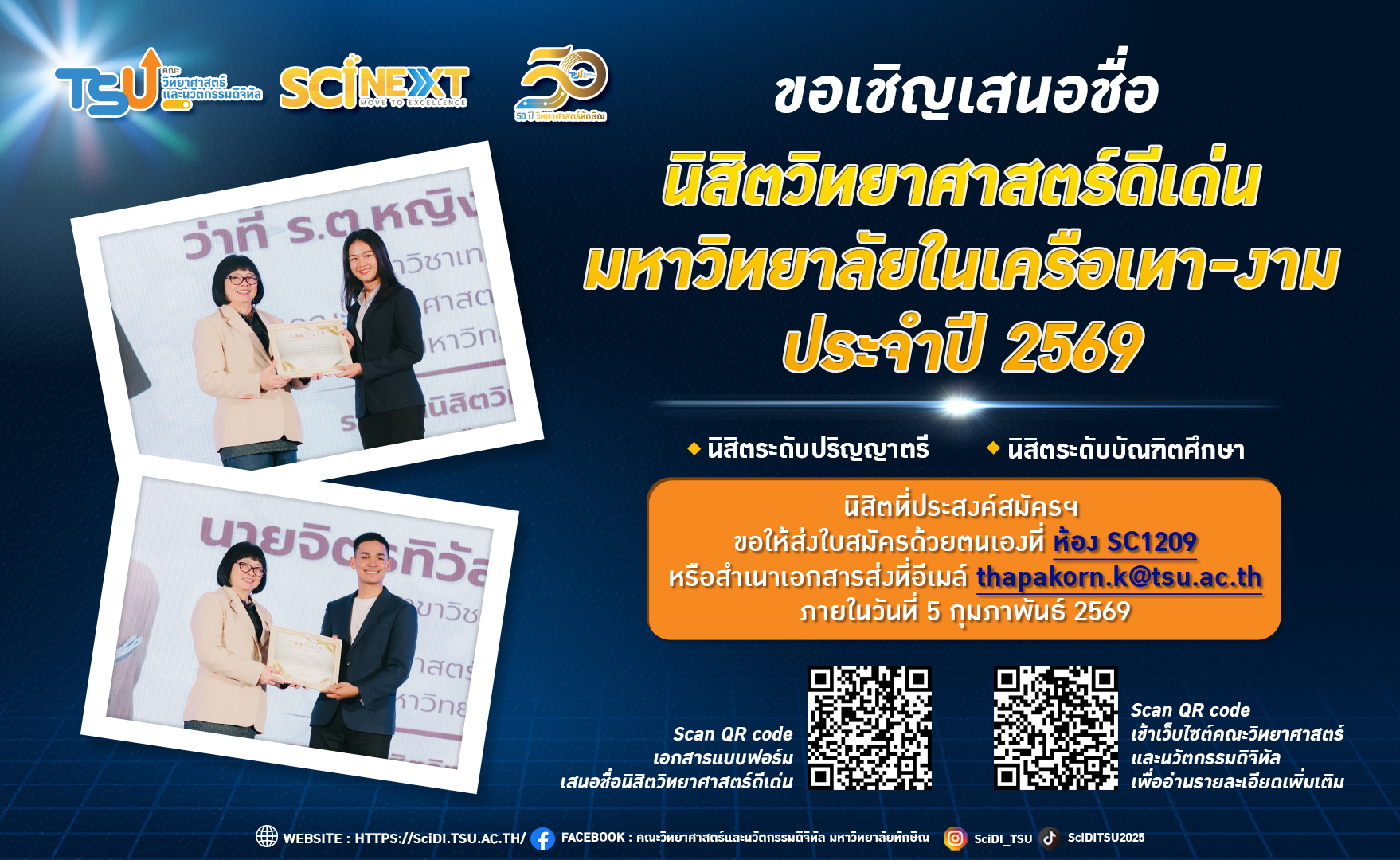 ขอเชิญเสนอชื่อนิสิตวิทยาศาสตร์ดีเด่น มหาวิทยาลัยในเครือเทา–งาม ประจำปี 2569