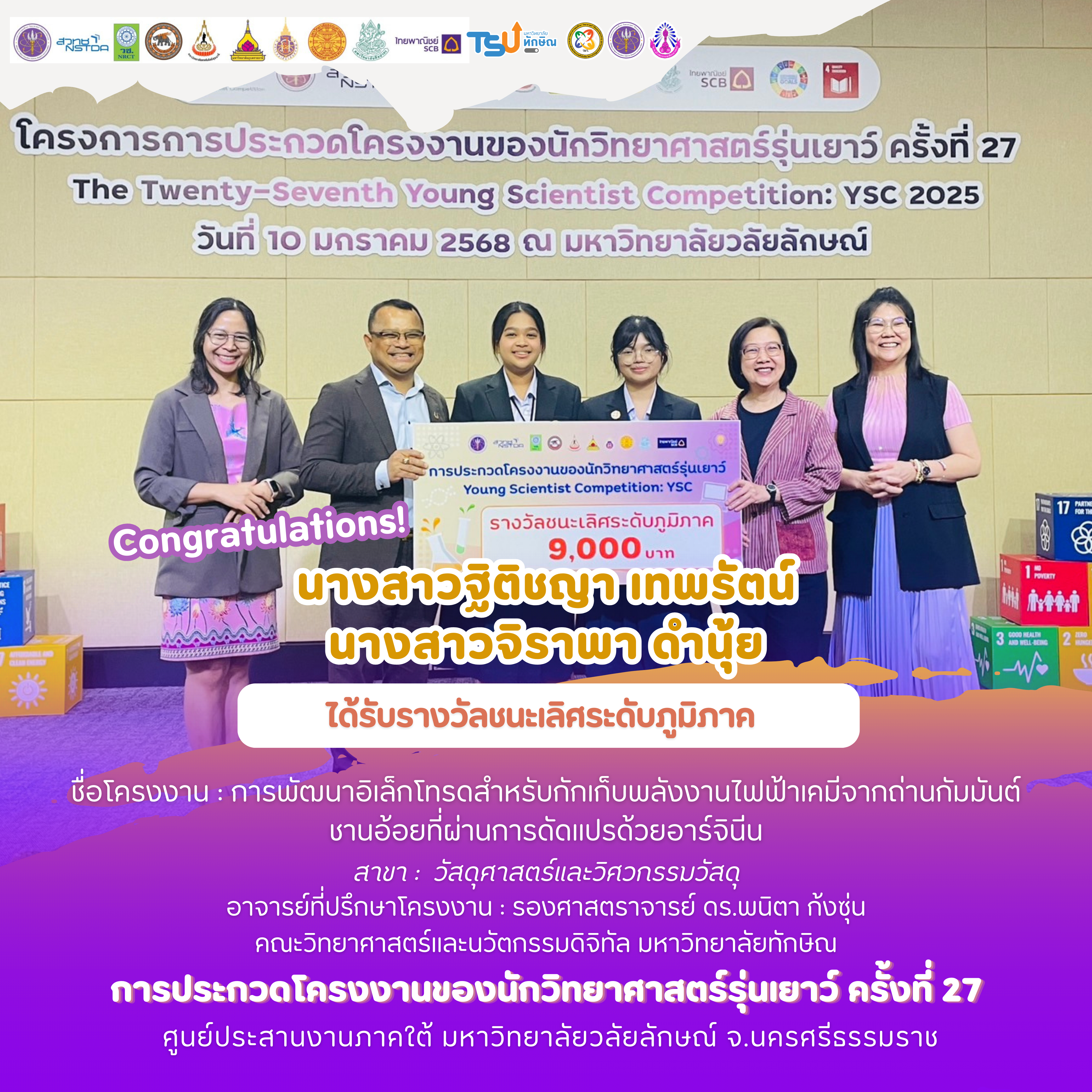 โครงการ วมว. - ม.ทักษิณ ขอแสดงความยินดีกับนักเรียนที่ได้รับรางวัล “ชนะเลิศระดับภูมิภาค (ภาคใต้) ” จากการประกวดโครงงานนักวิทยาศาสตร์รุ่นเยาว์ ครั้งที่ 27 (YSC 2025) ณ มหาวิทยาลัยวลัยลักษณ์