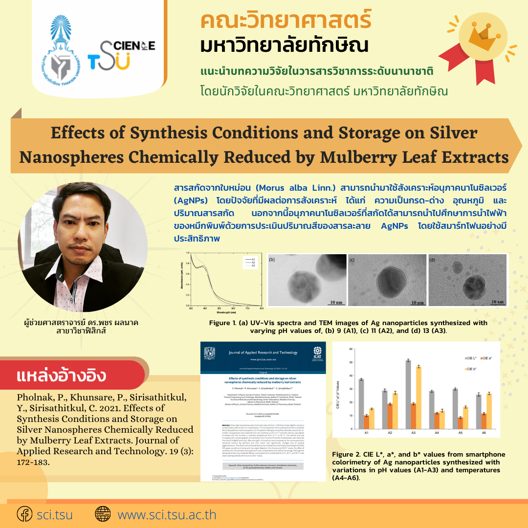 Effects of Synthesis Conditions and Storage on Silver Nanospheres Chemically Reduced by Mulberry Leaf Extracts โดย ผศ.ดร.พชร ผลนาค