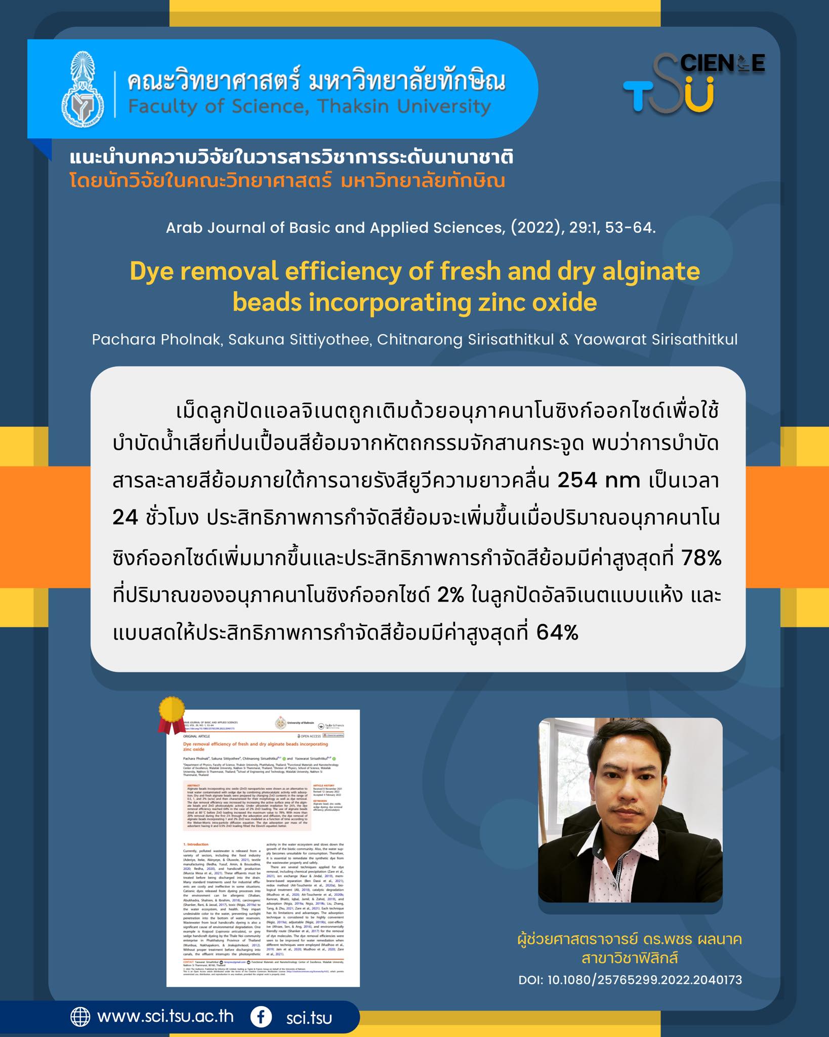 Dye removal efficiency of fresh and dry alginate beads incorporating zinc oxide โดย ผศ.ดร.พชร ผลนาค
